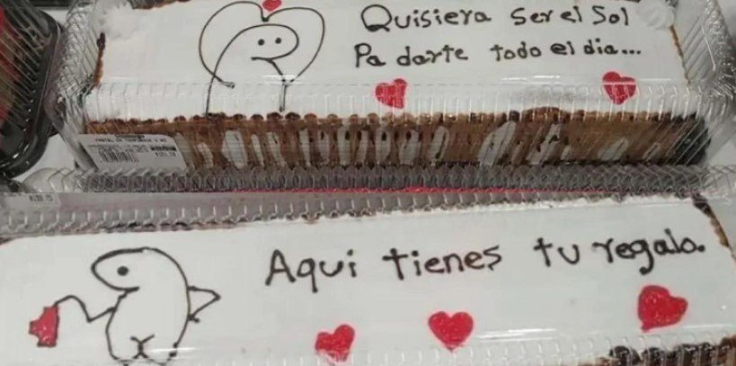 «Quisiera ser el sol pa’ darte todo el día…», «No te puedo bajar la luna, pero si los calzones» o «Aquí tienes tu regalo» son algunas de las propuestas del pastelero para que no quedes mal en San Valentín con el dulce presente y luego se lo coman alejados de las miradas.